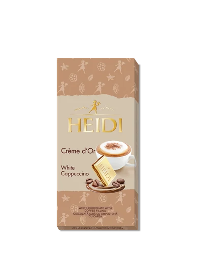 Gazdag étcsokoládé finom cappuccino krémmel töltve. A Heidi Creamy Cappuccino a kávé és a minőségi csokoládé elegáns kombinációját kínálja, mely krémes, selymes ízélményt nyújt.