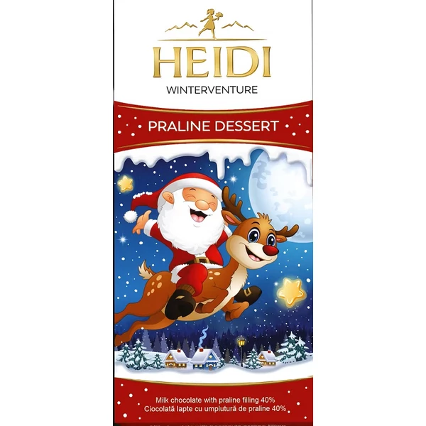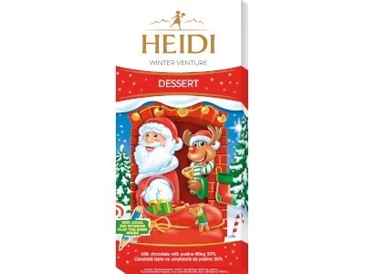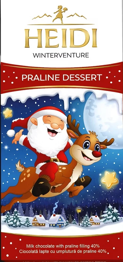 Ünnepi tej- és étcsokoládé duó mikulás- és rénszarvasfigurákkal, karácsonyi fűszerekkel. A Heidi Winterventure Dessert Santa & Rudolf krémes állaga és fűszeres aromái varázslatos ízélményt nyújtanak a téli ünnepek alatt.