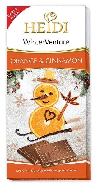 Gazdag étcsokoládé narancsos-fahéjas töltelékkel, mely a friss citrus és a meleg fűszeres aromák harmonikus egyvelegét hozza. A Heidi Winterventure Orange-Cinnamon különleges, ünnepi ízélményt kínál minden falatban.