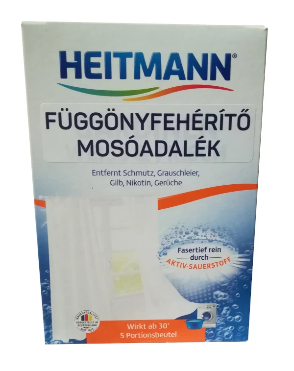 A Heitmann Függönyfehérítő Mosóadalék Por segít megőrizni függönyei tisztaságát és fehérségét minden mosás után.