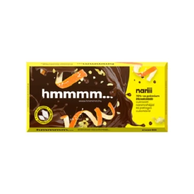 A Hmmm Táblás Csoki 70 g Nariii egy ízletes, narancsos aromával gazdagított édesség, amely a klasszikus tejcsokoládé krémességét ötvözi a friss, citrusos narancs ízével. A narancsos jegyek játékos, üde karaktert adnak a csokoládénak, így ideális választás desszertnek vagy nasihoz bármikor a nap folyamán.