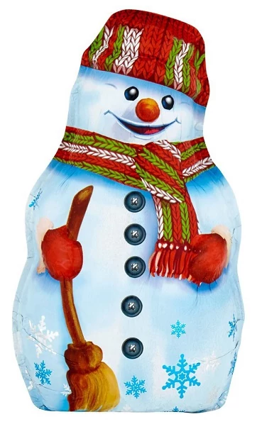 Finom tejcsokoládéból készült hóember figura, vidám ünnepi csomagolásban. Tökéletes karácsonyi ajándék vagy dekoráció.