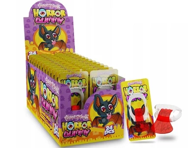 Mókás és félelmetesen finom meglepetés! A Horror Gummy egy vidám édesség kisgyermekeknek és játékos lelkületű felnőtteknek. A csomag tartalmaz egy műanyag vámpírfogat beépített gumicukor nyelvvel, amely egyszerre vicces játékszer és rágcsálnivaló. Tökéletes Halloweenre, bulikra vagy akár apró ajándéknak.