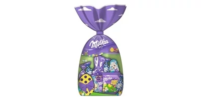 Válogatott Milka tejcsokoládé finomságok húsvéti ajándékcsomagban, ideális ünnepi nassolnivaló.