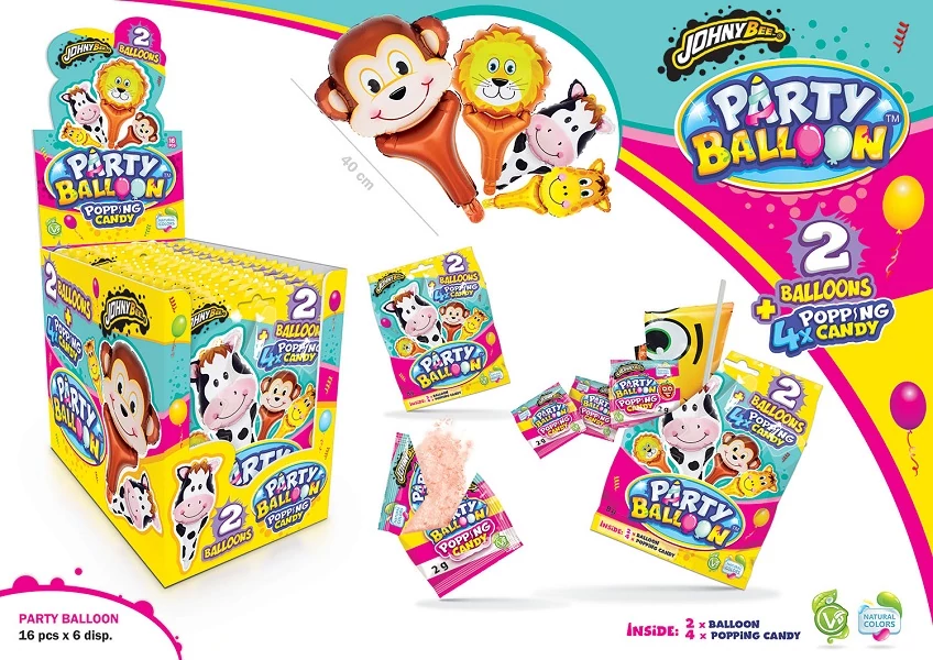 Johny Bee - Party Ballon 4 x 2 g eper ízű bombacukorkák, 2 db 40 cm szívószállal felfújható celofán lufi.