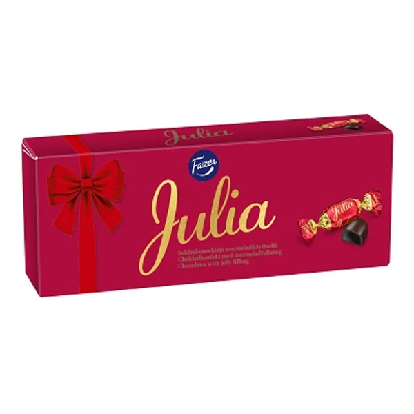 Fazer Julia – a klasszikus finn csokoládépraliné, amely évtizedek óta elbűvöli a csokoládéimádókat. Finom étcsokoládé borítja a gyümölcsízű zselés tölteléket, tökéletes ajándék vagy ünnepi édesség.