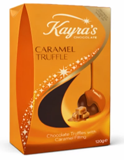 Karamell ízesítésű trüffel desszert kakaós bevonattal. Kanalazható desszerttermék.