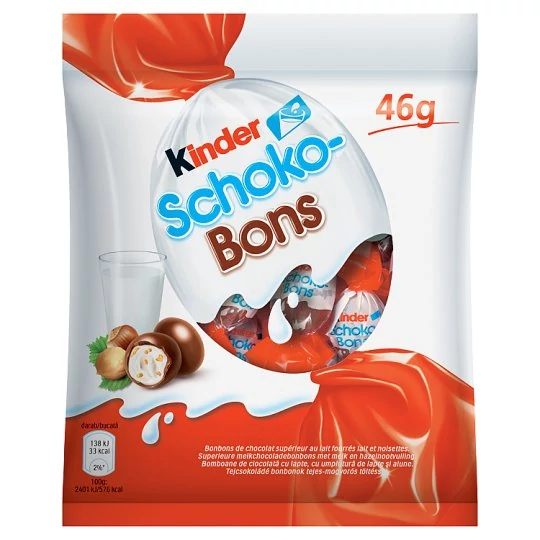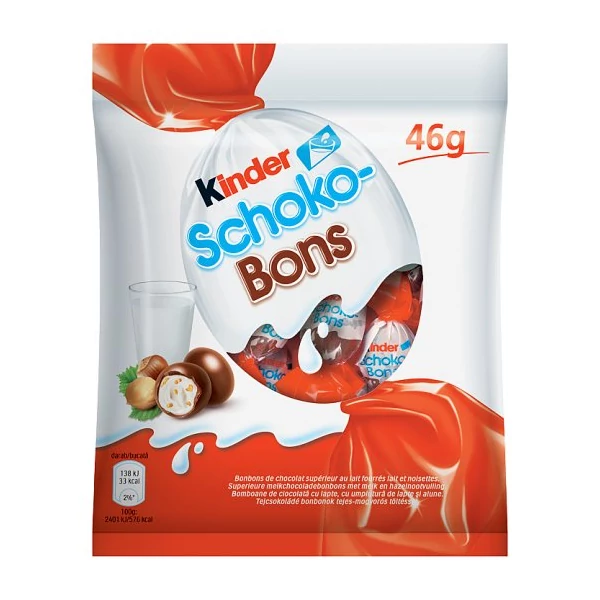 Tejcsokoládé 50% (cukor, teljes tejpor, kakaóvaj, kakaómassza, emulgeálószer: lecitinek (szója); vanillin), Cukor, Sovány tejpor (12,5%), Pálmaolaj, Mogyoró (5,8%), Dehidratált vaj, Csokoládé (cukor, kakaómassza, kakaóvaj, emulgeálószer: lecitinek (szója); vanillin), Fényezőanyagok (gumiarábikum, sellak), Glükózszirup, Emulgeálószer: lecitinek (szója), Aromák, Kakaószárazanyag-tartalom a tejcsokoládéban legalább 30%, a csokoládéban legalább 35%., Összes tejszárazanyag: 28% - Összes kakaó összetevő: 16%.