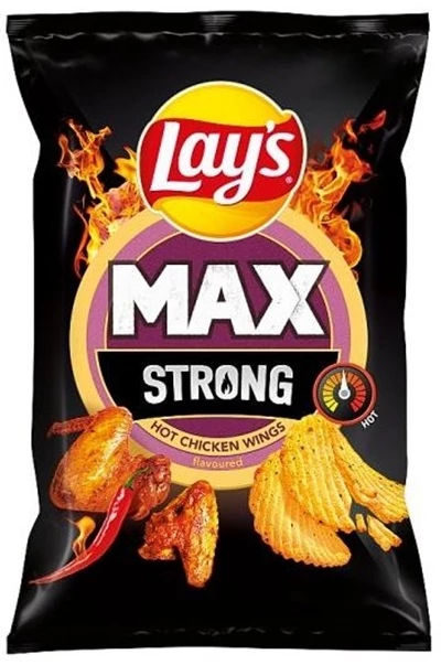 Ropogós burgonyachips intenzív, csípős „hot chicken wings” ízesítéssel — ideális snack pikáns ízek kedvelőinek.
