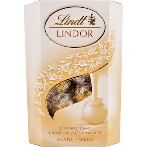 Lindt Lindor, Blanc, Lindor lágyan olvadó fehércsokoládé krémmel (44%) töltött fehércsokoládé golyók