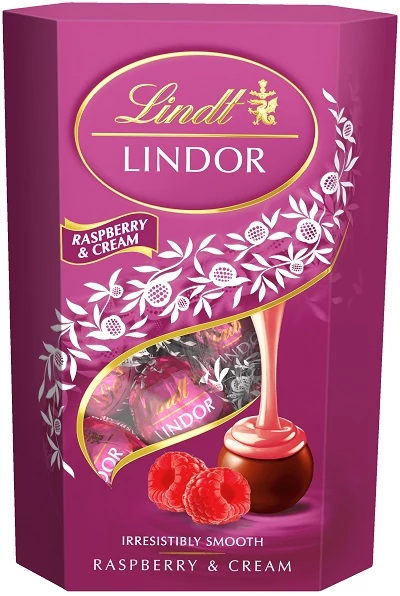 A Lindt Lindor Raspberry & Cream 200 g-os doboz tejcsokoládé trüffeleket kínál: olvadó, sima mázzal bevont, lágy málna-krémtöltelékkel. Egy igazán elegáns és élvezetes édességélmény.