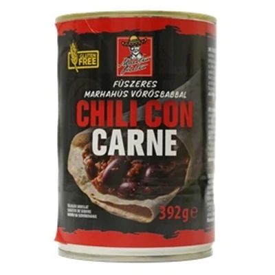 Víz, darált marhahús 35%, bab 15%, paradicsom 12%, vöröshagyma, pirospaprika, chili, növényi olaj, só, fűszerek (kömény, bors, oregánó), fokhagyma, savanyúságot szabályozó anyag: citromsav.