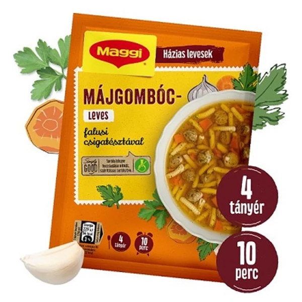 A Maggi Májgombóc Falusi Csigatésztás Leves egy gyorsan elkészíthető, tartalmas levesélmény, mely klasszikus magyar ízeket idéz. A májgombócok és a hagyományos falusi csigatészta tökéletes párost alkotnak, hogy egy finom, házias leves szülessen akár percek alatt.