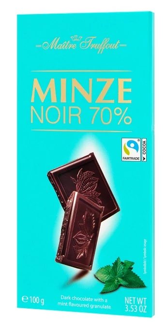A Maitre Truffout Minze Noir egy kiváló minőségű, 70% kakaótartalmú étcsokoládé, frissítő mentolos aromával. Az intenzív étcsokoládé és a hűsítő menta tökéletes harmóniát alkot, így ideális választás a különleges ízek kedvelőinek. Fogyasztható önmagában, kávé mellé vagy desszertként.
