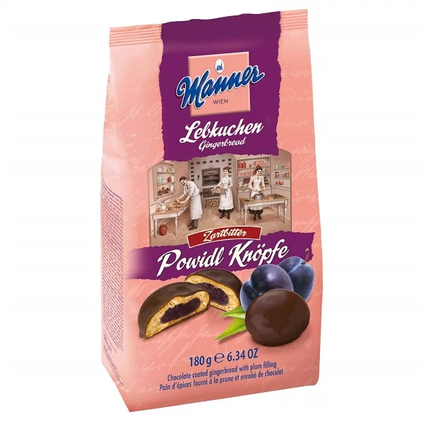 Lágy, fűszeres mézeskalács korongok finom szilvás töltelékkel és étcsokoládé bevonattal. A Manner Knöpfe karácsonyi különlegessége harmonikusan ötvözi a gyümölcsös és fűszeres ízeket, ideális ünnepi nassolnivaló.