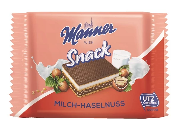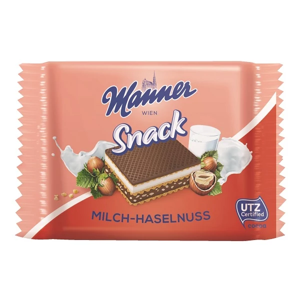 Ostyaszelet tejkrémes (37%) és búzapelyhes mogyorókrémes (37%) töltelékkel, részben kakaós glazúrba (10%) mártva