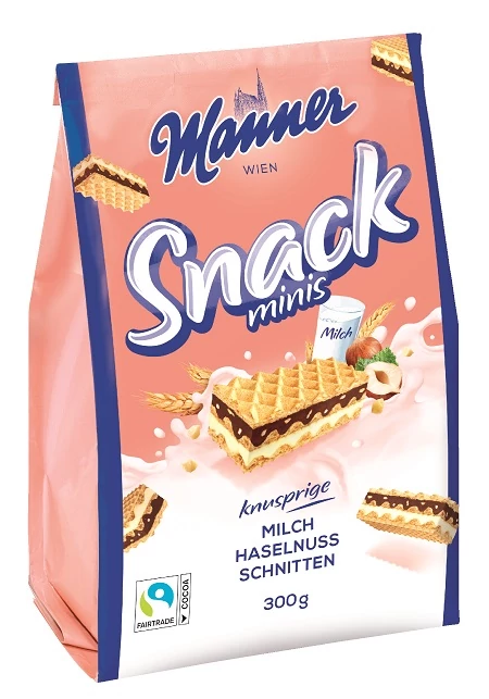 Mogyorókrémmel (82%) töltött, teljes kiőrlésű lisztből (őrlési frakciókból kevert) készült ropogós ostyaszelet, 30%-kal kevesebb cukortartalommal