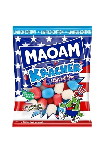 Az amerikai hangulatú Maoam Kracher USA Edition háromféle ízben – Chicago Cherry (cseresznye), Liberty Lemon (citrom) és Rodeo Raspberry (málna) – kínál pezsgő, szénsavas töltelékkel készült, színes, cukrozott rágóbonbonokat. A termék a nemzeti színekben pompázó csomagolásával és izgalmas ízvilágával igazi csemege a nassolni vágyóknak. Összetevők: cukor, glükózszirup, pálmazsír, nedvesítőszer (szorbitolszirup), savanyúság-szabályozók (citromsav), zselatin, gyümölcs- és növényi koncentrátumok (édesburgonya, spirulina, sáfrányos szeklice, alma), savanyúság-szabályozó (nátrium-hidrogén-karbonát), aroma, napraforgóolaj, bevonóanyagok (fehér és sárga méhviasz), csomósodásgátló (talkum). Allergén információ: Tartalmaz zselatint. Nyomokban előfordulhatnak tej és gluténtartalmú gabonák. Tárolás: száraz, hűvös helyen (15–20 °C), fénytől és nedvességtől védve.Maoam Kracher USA Edition 200 g