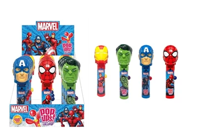 10 g-os Marvel Pop Ups! nyalóka, vegyes ízekben. Színes, gyümölcsös ízekkel, egyedi formában, a Marvel karakterek mintázatával.