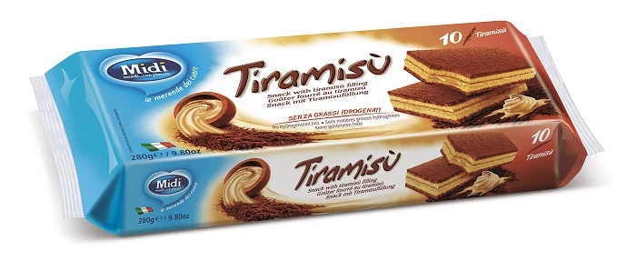 | Specifikáció alapján teljes megnevezés | MIDI Töltött piskóta szelet tiramisu 10*28g |