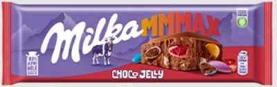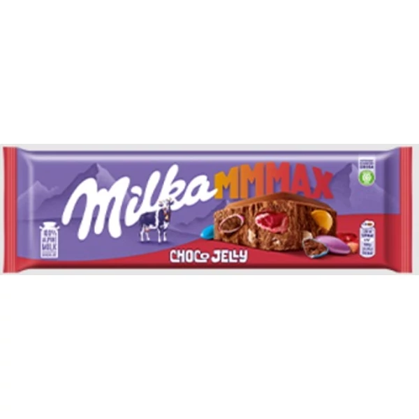 Alpesi tejcsokoládé meggyízű zselédarbákkal (7%), kakaós töltelékű színes cukordrazséval (6%) és robbanócukorkával (4%).