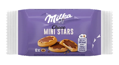 A Milka Choco Mini Stars apró csillag formájú tejcsokoládé darabkákból álló édesség. Krémes tejcsokoládé ízvilágát a Milkára jellemző lágy textúra és kiegyensúlyozott kakaós jegyek teszik teljessé. A 37,5 g-os kiszerelés praktikus és könnyen adagolható.