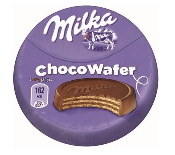 Kakaós töltelékkel (27%) töltött, alpesi tejcsokoládéval bevont (60%) ostya