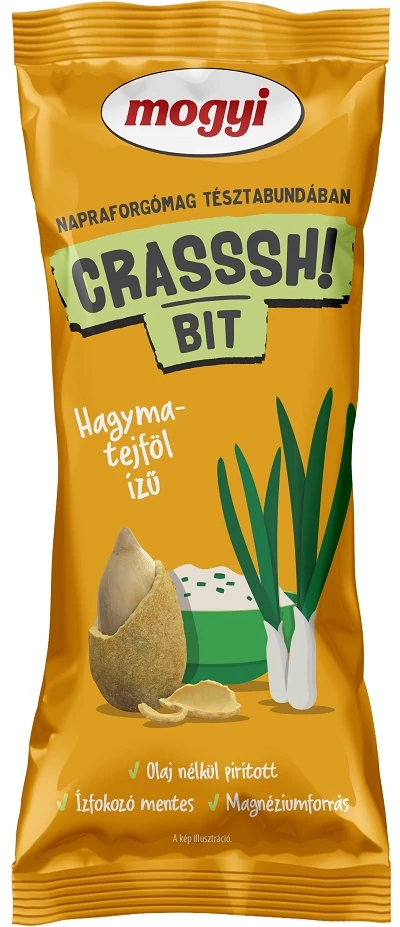 Hántolt, pirított napraforgómag ropogós tésztabundában, hagymás-tejfölös ízesítéssel – ízfokozó- és olajmentes, magnéziumban gazdag. Előállítás során előfordulhat földimogyoró és diófélék. Tartalmaz búzát (glutén). Nem tartalmaz ízfokozót. Magnéziumforrásként is kiemelt.Mogyi Crasssh! BIT Napraforgómag Hagymás-Tejföl ízű 70 g