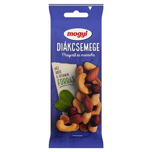 Magas minőségű diákcsemege keverék mazsolával és olajos magvakkal. Tartalmaz földimogyorót, kesudiót, mandulát, mogyorót; előfordulhatnak egyéb diófélék és glutén is.Mogyi Diákcsemege 70 g