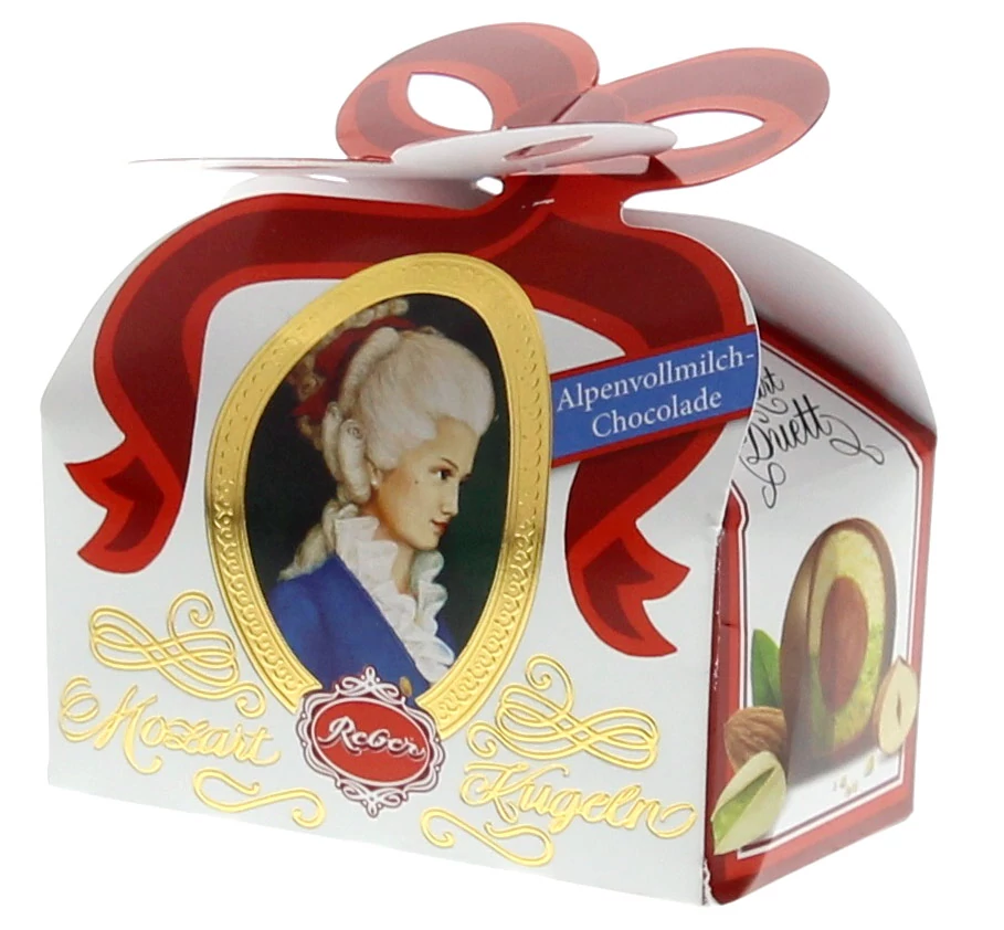 Két válogatott Reber Mozart-gömb – mindkettő külön csomagolású – prémium minőségű porcukorral bevont marcipánnal, mogyoró-nougat töltelékkel, belül finom pisztácia-marzipánnal. Összetevők: cukor, mandula (36 % marcipánban), kakaobutter, tejpor, mogyoró (36 % nougatban), kakaómassza, tejcukor, invertcukorszírup, pisztácia (3,5 % marzipánban), invertáz (humektáns), glicerin, emulgátor (napraforgó-lecitinek), alkohol, rum, természetes aroma (rum). Kisnyomokban előfordulhatnak szója, tojás és búza. :contentReference[oaicite:2]{index=2} Allergén információ: Tartalmaz mandulát, mogyorót, tejterméket, pisztáciát. Nyomokban előfordulhatnak búza, tojás, szója. :contentReference Tárolás: száraz, hűvös helyen, 15–20 °C között, közvetlen napfénytől védve.Mozart Constanze® Duett 40 g