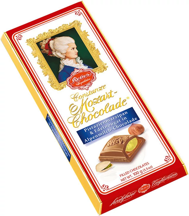 Alpesi tejcsokoládé (72%) mogyoró nugáttal (18%) és pisztácia marcipán töltelékkel (10%)