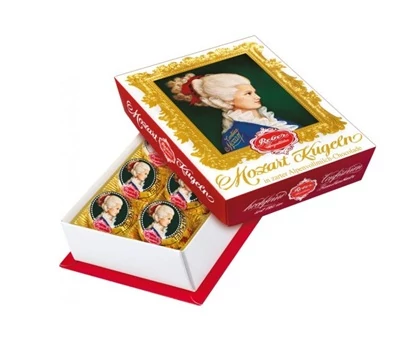 Mozart Reber Constanze Golyó 120 grammos, mely gazdag, töltött csokoládé golyókat kínál kiváló minőségű alapanyagokból.