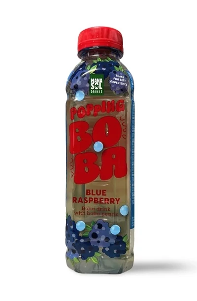 Frissítő, kék málna ízű ital üvegben—könnyed, üdítő élmény popping boba gyöngyökkel, melyek harapásra gyümölcsös „pukk”-kal robbannak a szájban. Ideális nyári frissítőnek, desszertnek vagy különleges élményként.