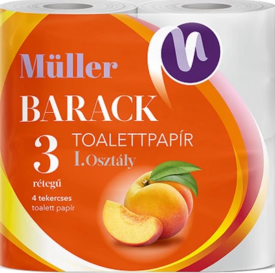 Puha és erős háromrétegű WC-papír, amely kíméletes a bőrhöz, kellemes barack illattal, 4 tekercses kiszerelésben.