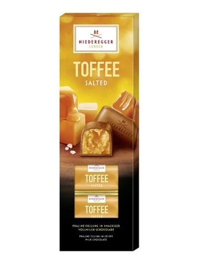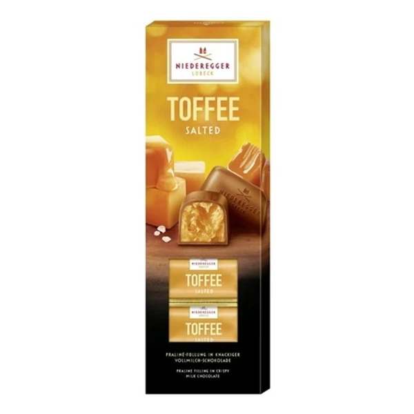 Tartalmaz: tej, szója. Nyomokban előfordulhatnak diófélék. Tartsa hűvös, száraz helyen, közvetlen napfénytől védve.Niederegger Toffee Salted Chocolate Praliné – 100 g