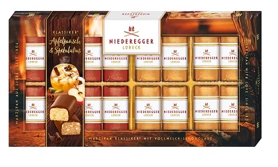 Prémium válogatás karácsonyi hangulatban: marcipán pralinék ét- és tejcsokoládé bevonattal, fűszeres és gyümölcsös ízekkel (alma, whiskey, fahéj, mogyoró).