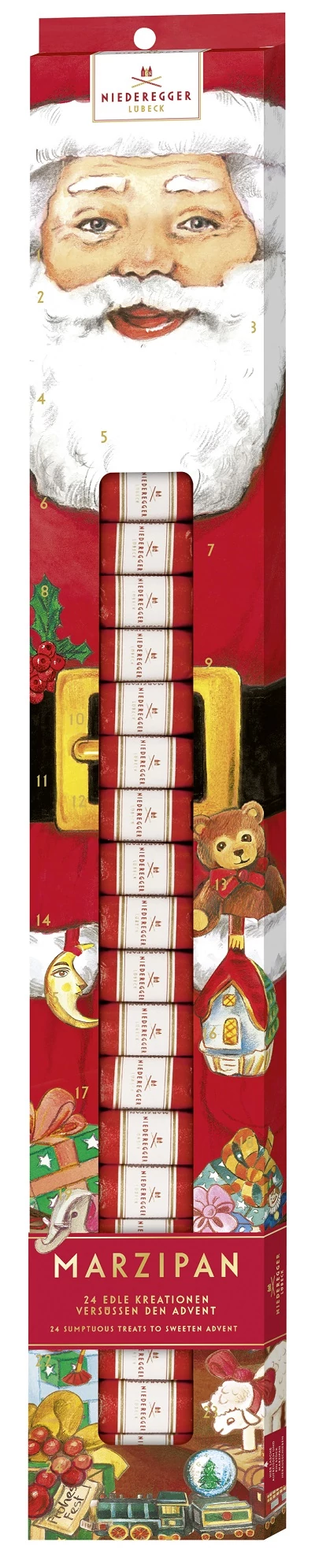 Elegáns Santa Claus dizájnú adventi naptár, 24 darab prémium marcipán- és étcsokoládé pralinéval – klasszikus ünnepi élmény minden napra.