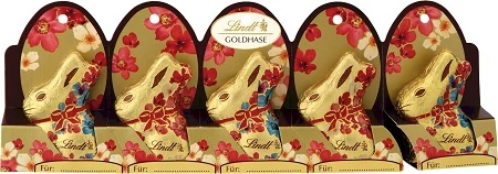 Lindt mini arany nyuszi virágmintával 50 g – prémium alpesi tejcsokoládé üreges figura tavaszi virágdíszítéssel.