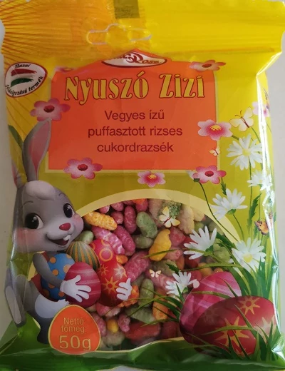 Húsvéti nyuszi formájú, színes csomagolású édesség, belsejében ropogós, cukrozott puffasztott rizsszemekkel (zizi). Kiváló választás gyermekek számára, locsolóknak vagy ünnepi ajándékcsomagba. Vidám, ünnepi hangulatot árasztó finomság, amely garantáltan mosolyt csal az arcokra.
