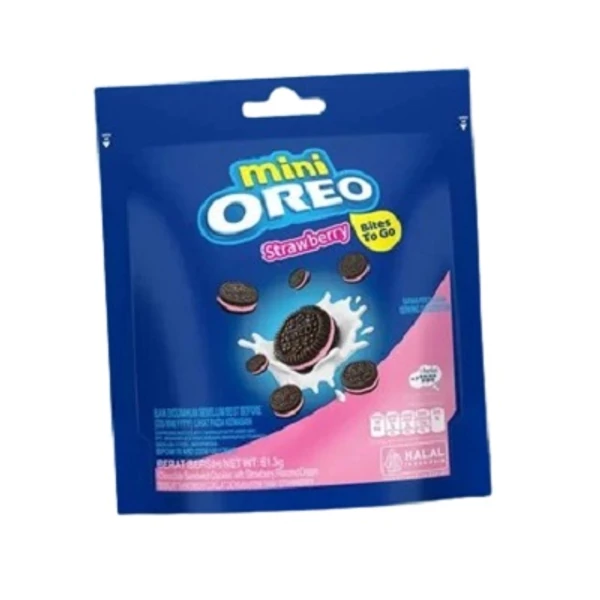 A Mini Oreo Zip Pack (61,3 g) eper ízű krémmel töltött mini kekszek praktikus, újrazárható csomagolásban – ideális nassolnivaló otthonra, irodába vagy útközben.