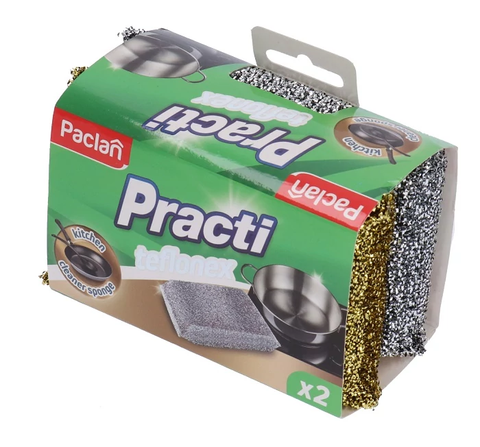 Kifejezetten teflon-edények tisztításához kifejlesztett szivacs a Paclan Teflonex. Fémszálas hatású, de a teflonos felületet megkímélő felülettel rendelkezik, 2 db-os csomagolásban kapható.