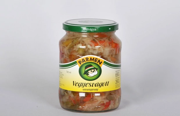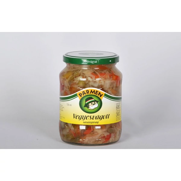A Parmen Vágott Vegyes Savanyúság 680 g válogatott zöldségek (uborka, karfiol, paprika, sárgarépa és hagyma) ízletes ecetes-lágyító páclében – remek köret, saláta vagy snack bármely étkezéshez.