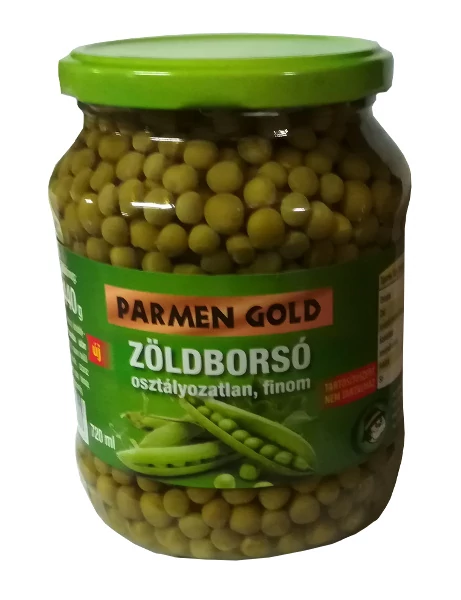 A Parmen Zöldborsó Osztályozatlan, Finom 690 g válogatott, konzervált zöldborsó szemek – sokoldalúan felhasználható köretnek, levesbe, salátába vagy egy gyors zöldséges fogáshoz.