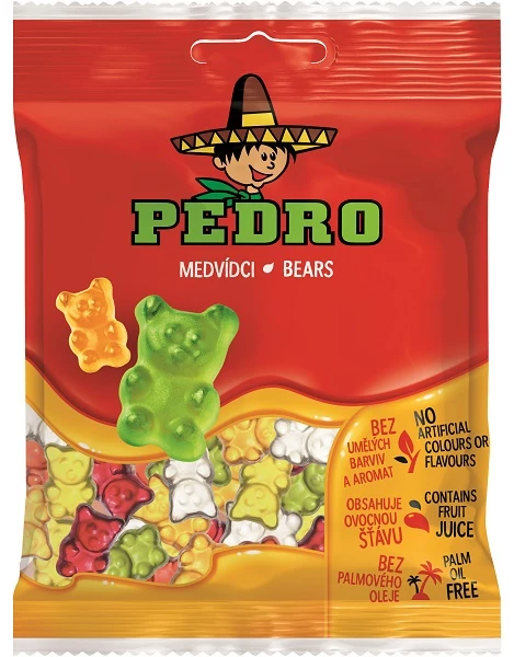Pedro medvék egyáltalán nem szőrösek, elelnben színesek és tele vannak az egzotikus ananász, a narancs, az édes cseresznye, az alma, valamint a frissítő citrom és ribizli ízével. Élvezze őket külön-külön vagy akár egyszerre. A macik bármikor készek mosolyt csalni az arcodra és megédesíteni minden pillanatodat.Pálmaolajat nem tartalmaz.