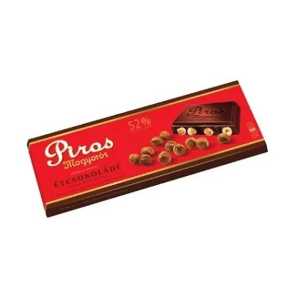 A Piros Mogyorós Étcsokoládé 225 g gazdag, magas kakaótartalmú étcsokoládé ropogós pörkölt mogyoró-darabokkal – intenzív, enyhén kesernyés csokoládéélmény és karakteres mogyoróíz minden falatban.