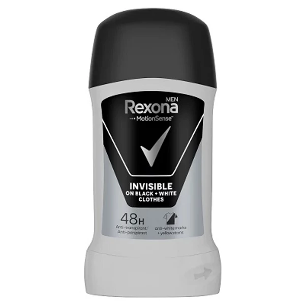 A Rexona Men Invisible Black & White stift 48 órás izzadásgátló védelmet biztosít, miközben megvédi a fekete ruhákat a fehér foltoktól és a fehér ruhákat a sárgulástól. Friss, férfias illatával egész nap magabiztosságot nyújt.