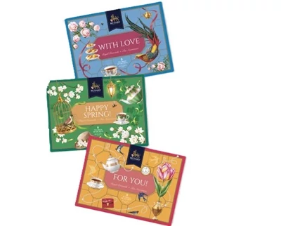 fekete és zöld teákat tartalmaz, elegáns, képeslap ihlette csomagolásban.