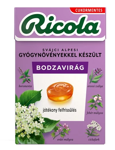Izomalt, Étkezési sav (almasav), Kivonatok (0,6%) bodzavirágból és a Ricola gyógynövény-keverékéből, amely az alábbi növényekből áll: lándzsás útifű, fehérmályva, borsmenta, kerti kakukkfű, orvosi zsálya, közönséges palástfű, cickafark, hasznos földitömjén, erdei mályva, bodzavirág, tavaszi kankalin, orvosi pemetefű, citromlé koncentrátum, édesítőszerek (aszpartám, aceszulfám K), természetes aromák, koncentrátumok (édesburgonya, répa), mentol.