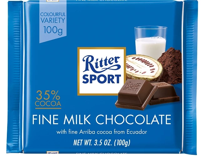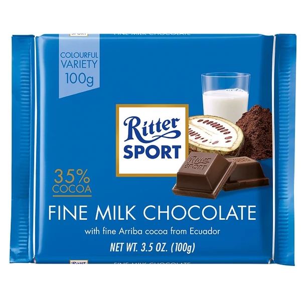 A Ritter Sport tejcsokoládé igazi klasszikus: 1934 óta olvasztja el a kakaóbab és a csokoládé szerelmeseinek szívét. A Tejcsokoládé klasszikus íze a nyugat-afrikai kakaó gazdag tónusaiból származik. A friss német tej bőséges adagja tökéletesíti ezt a finom csokoládémasszát. Minden darab csokoládé nemcsak 35% kakaót tartalmaz, hanem a friss tej ízét és a szájban lassan olvadó csokoládé élvezetét.