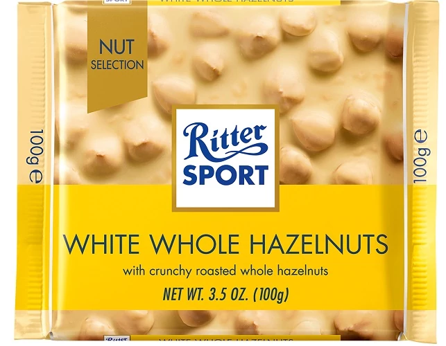 Fehér csokoládé egész mogyoróval (25%) és rizspehellyel (3%).